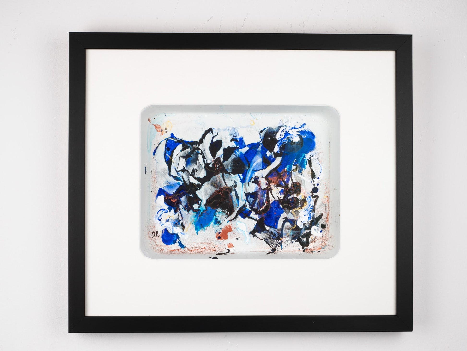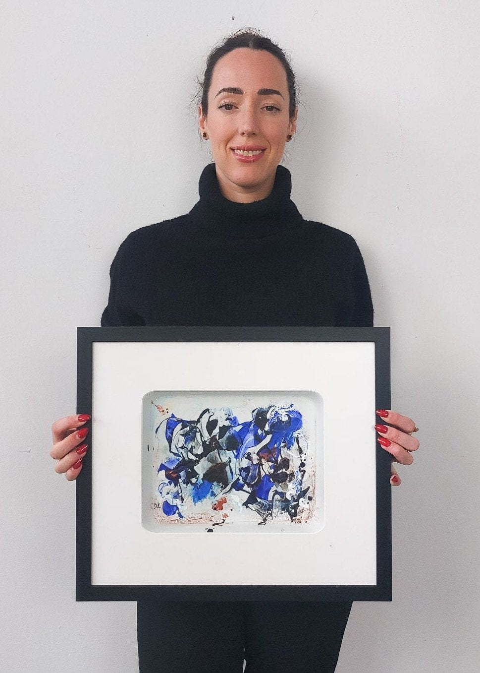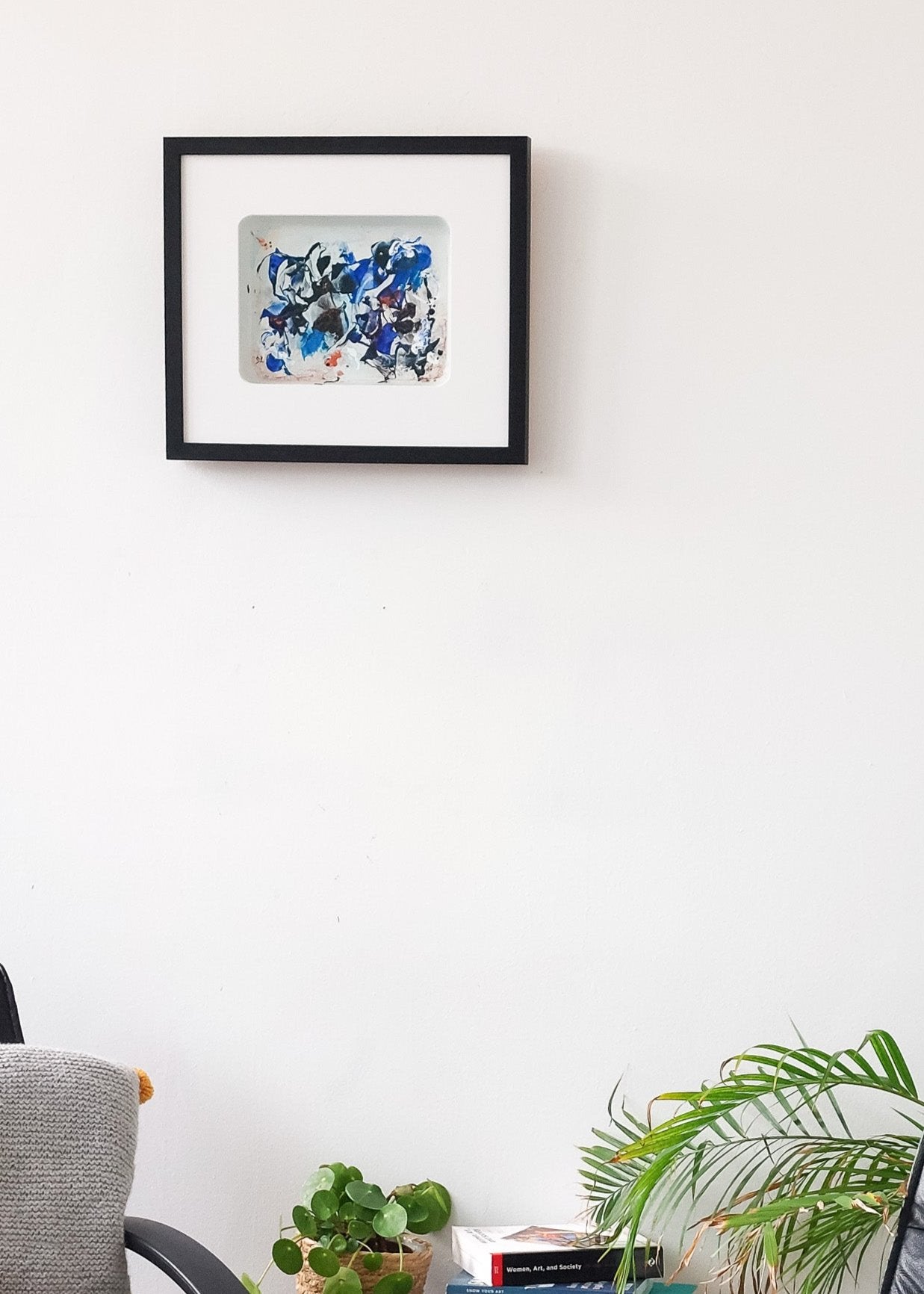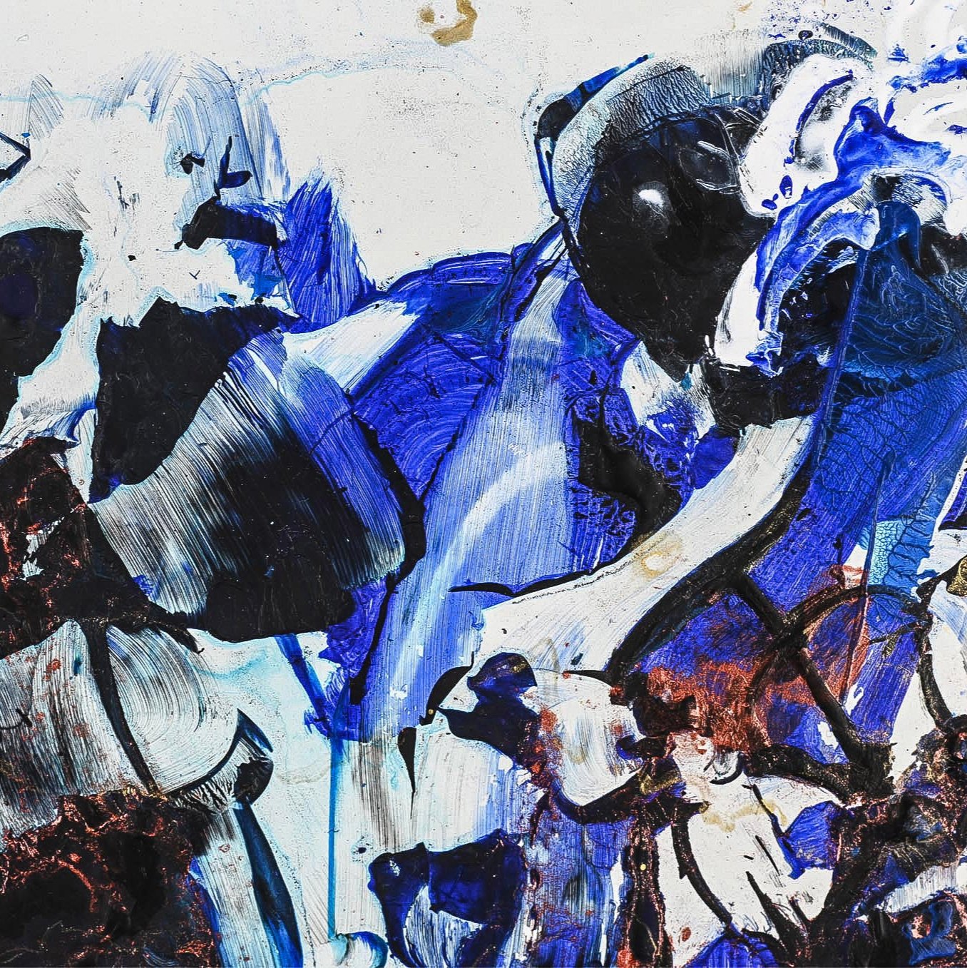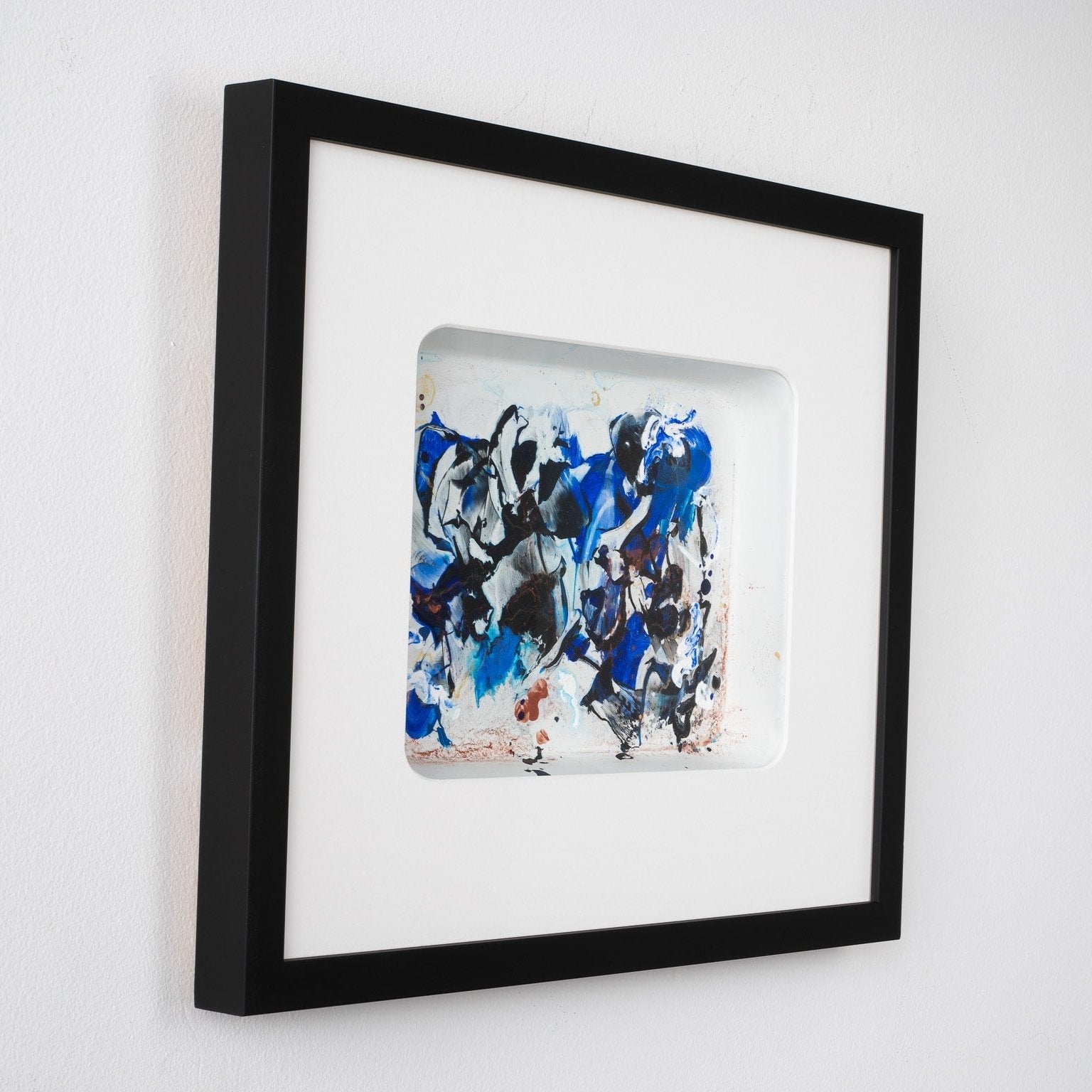 Elegant shades of blue engage in a graceful dance with bold black abstract marks, reminiscent of Picasso's Guernica in their structured allure. Upon closer examination, the intricate details unfold like flower petals gently swaying in the wind. A subtle sprinkling of accent copper delicately guides your gaze across the canvas, adding a touch of sophistication to this visual symphony.