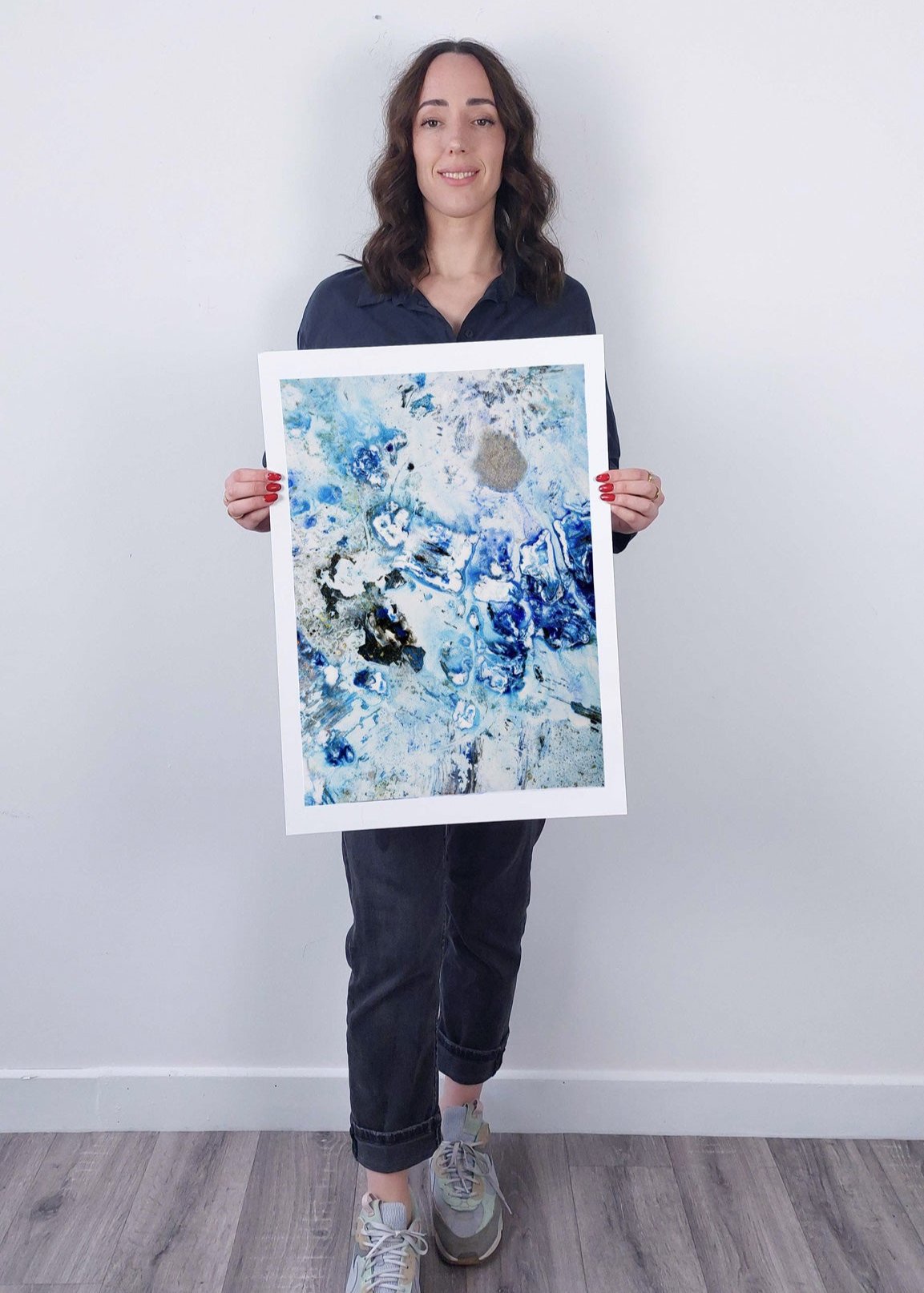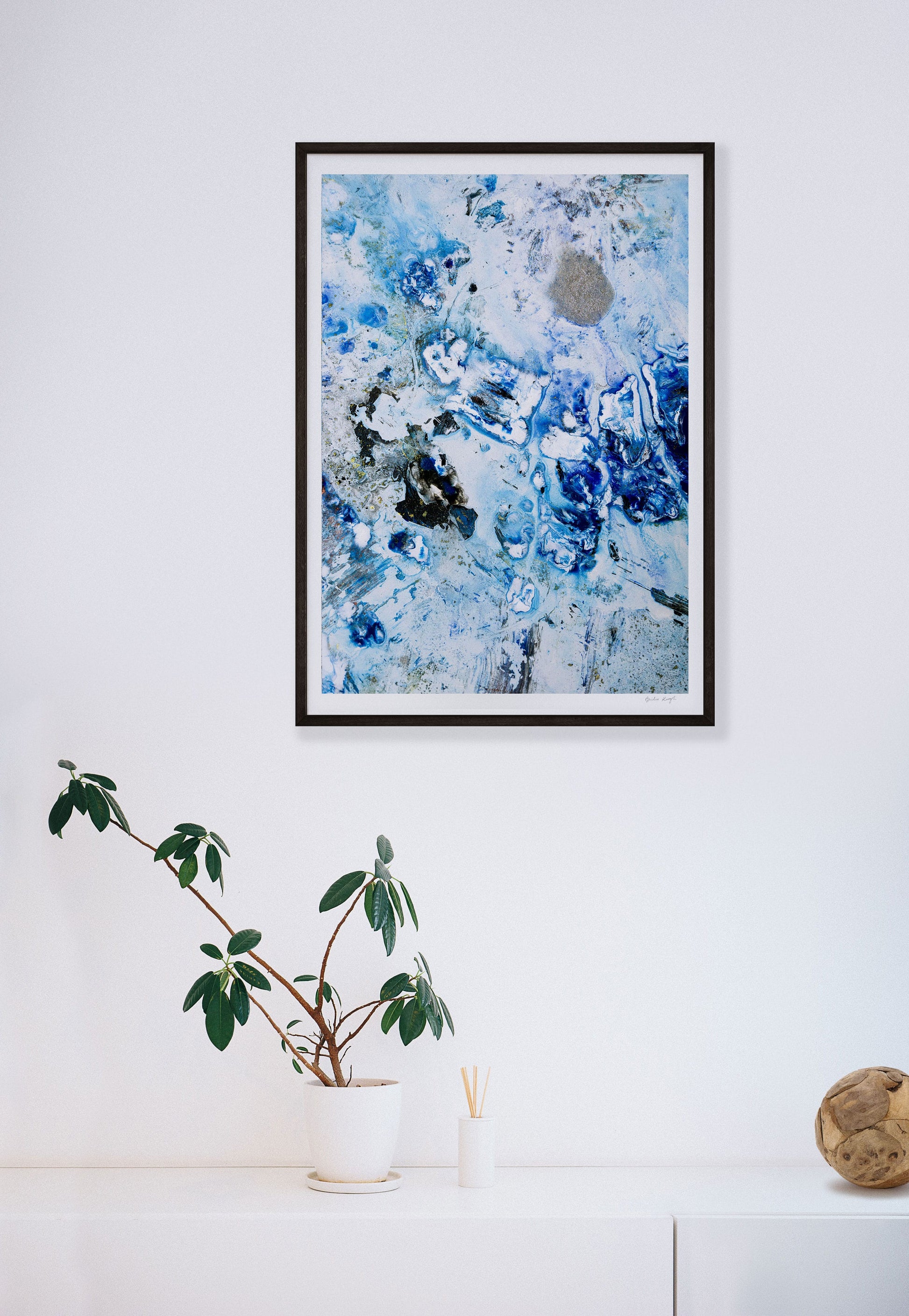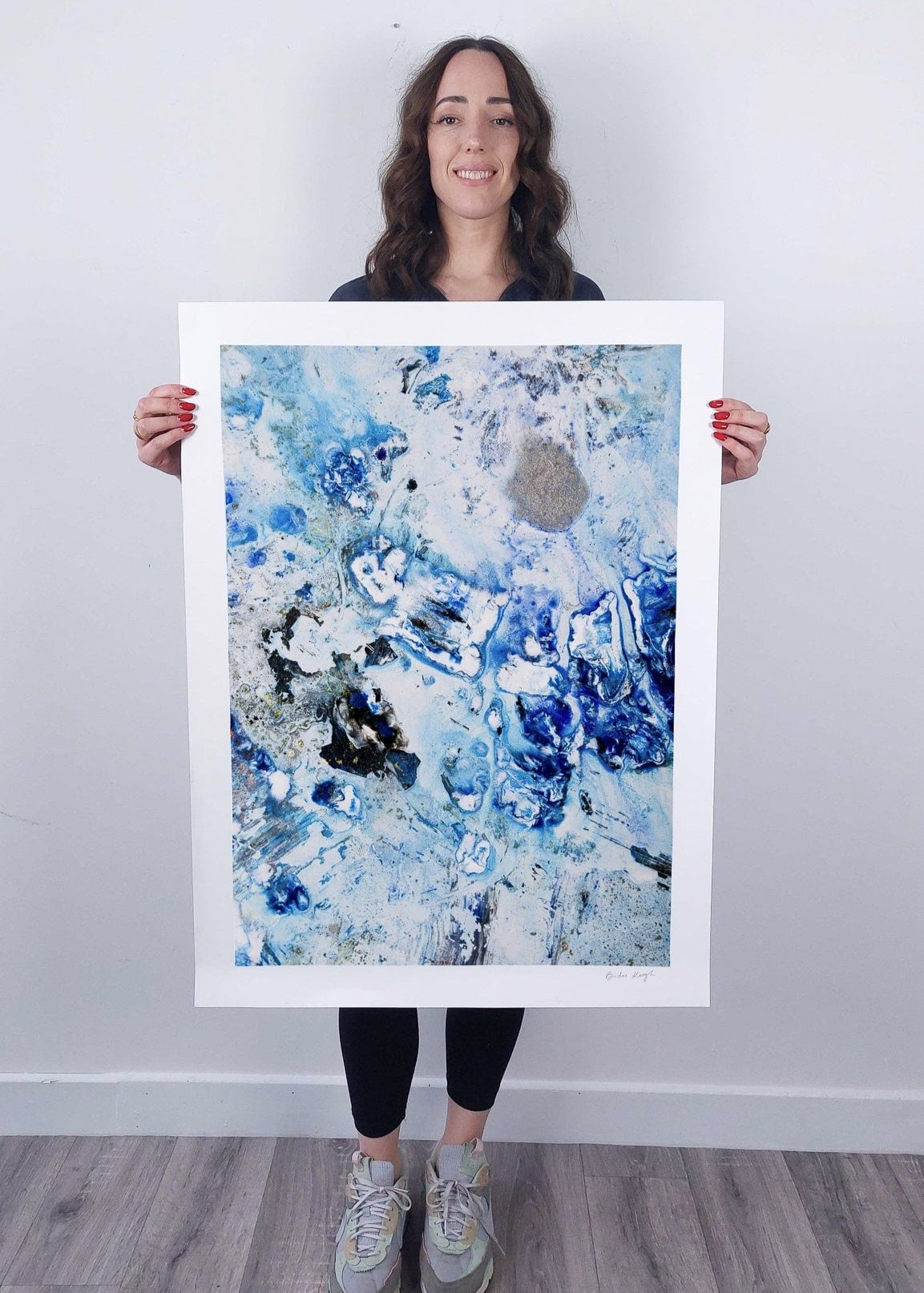 Elevate the elegance of your home with the Cruinne series. Cruinne is the Irish for 'Cosmos' — experience the depth of space, serene blue tones, and bold, dark brushstrokes in this framed Giclée print.