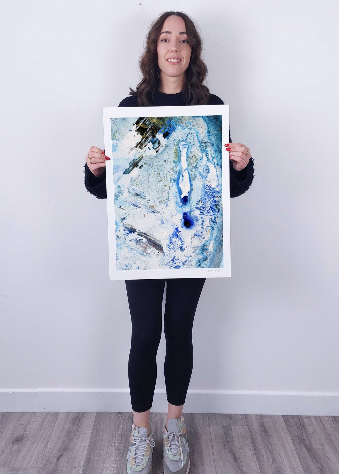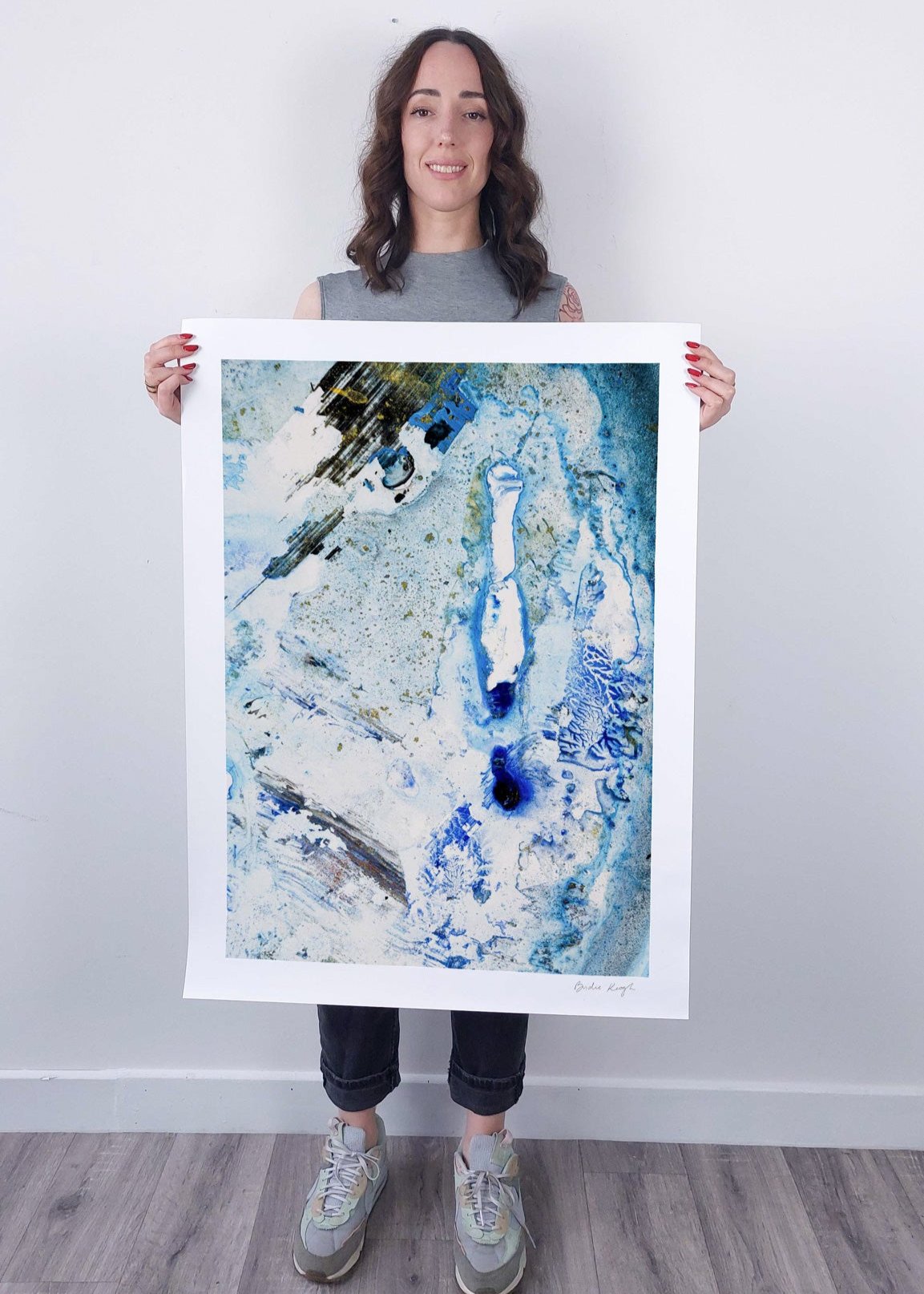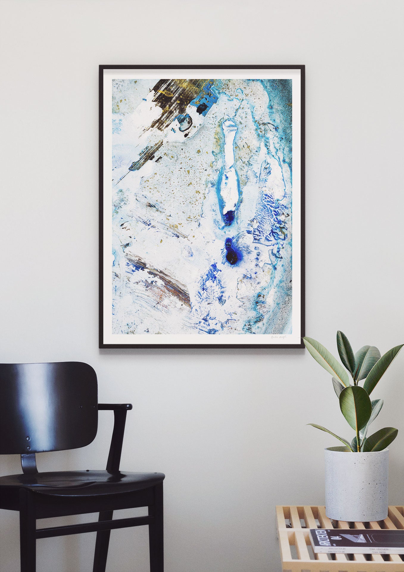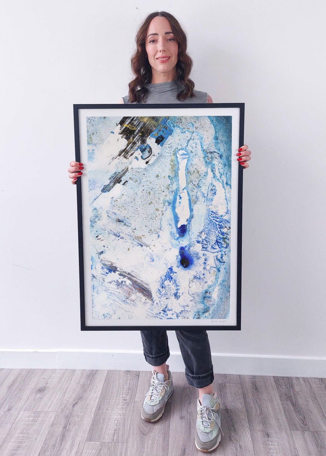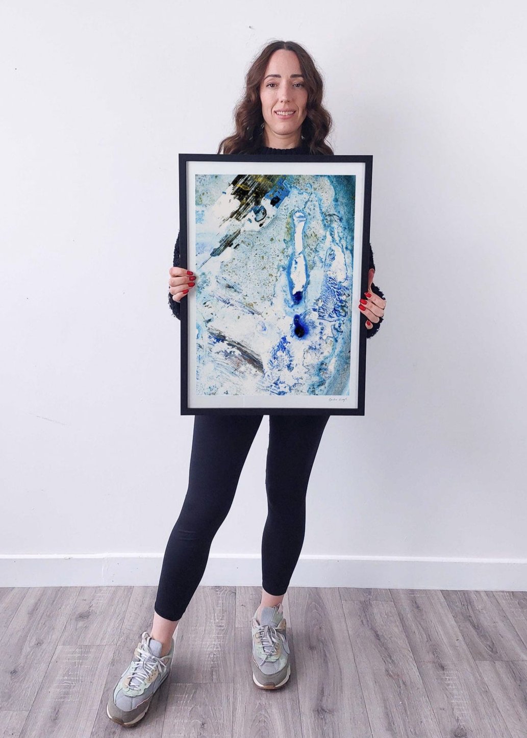 Elevate the elegance of your home with the Cruinne series. Cruinne is the Irish for 'Cosmos' — experience the depth of space, serene blue tones, and bold, dark brushstrokes in this framed Giclée print.