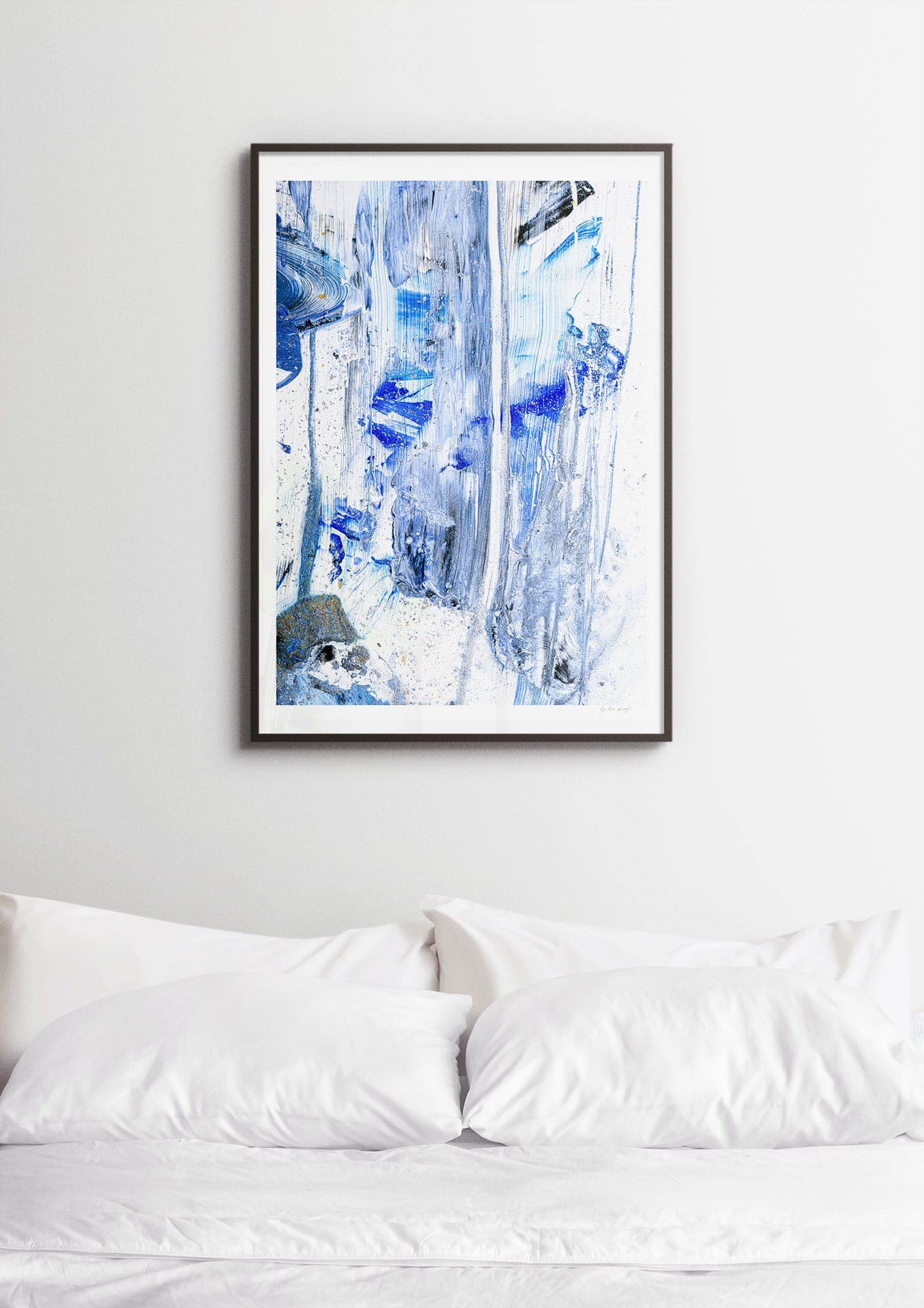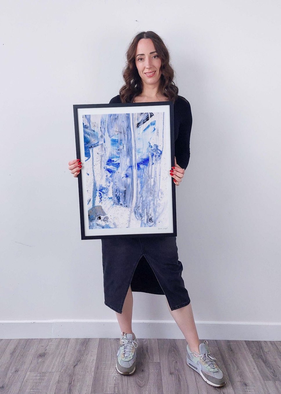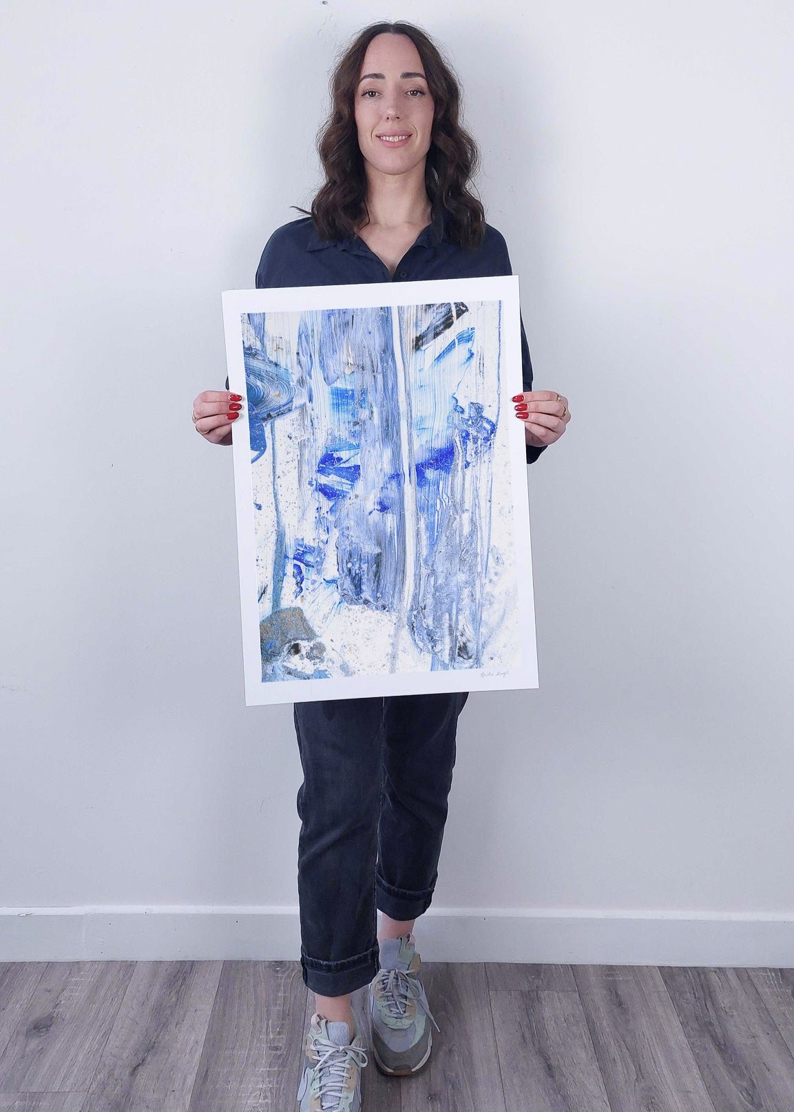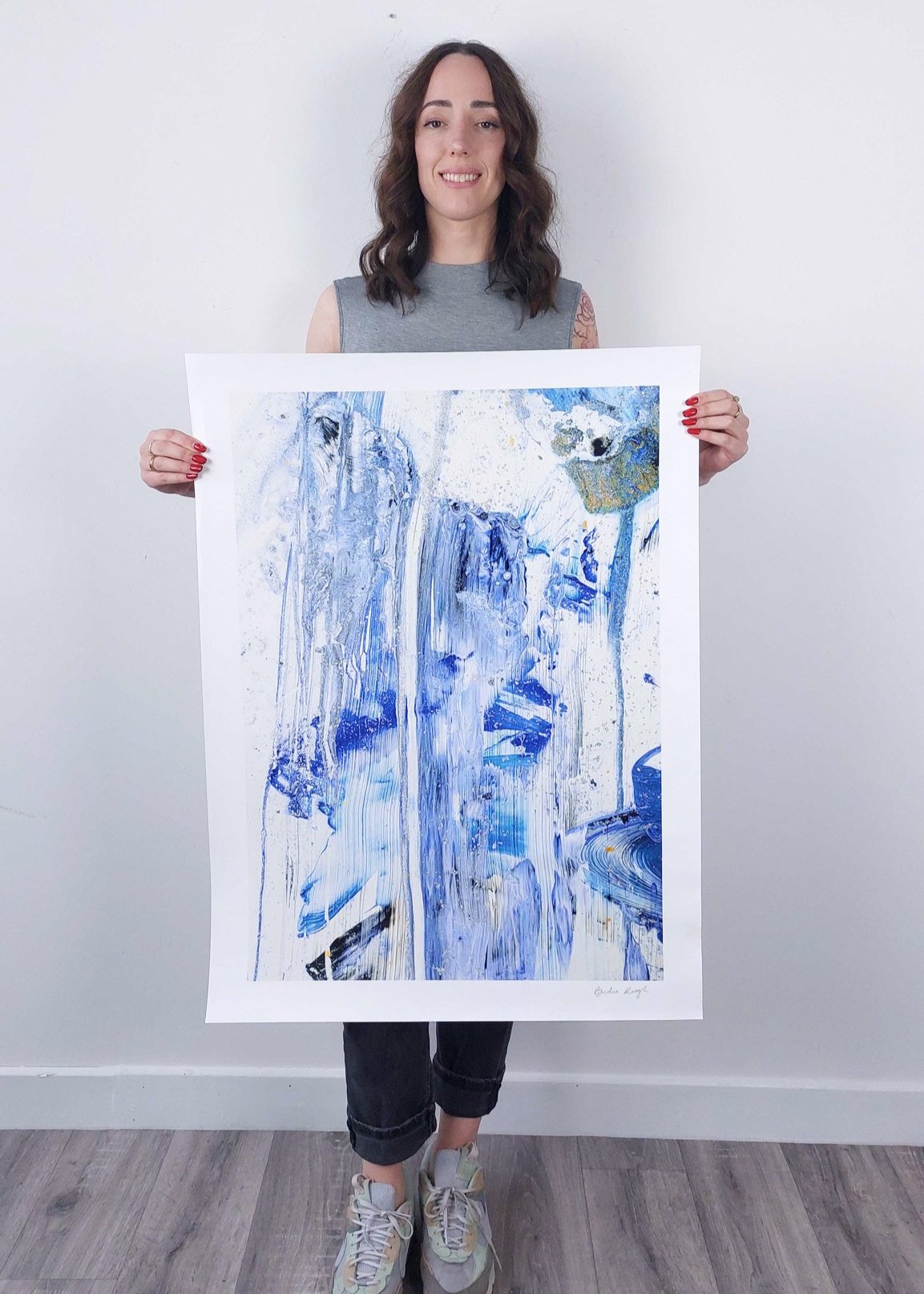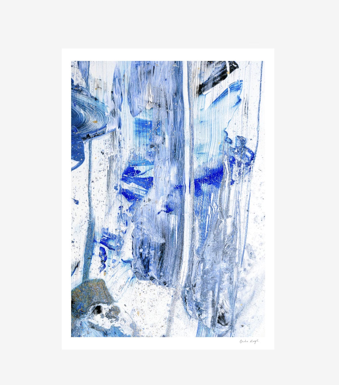 Transform your space with the Dótaí Órga collection—where serene blues meet gentle movement creating a calming focal point for your living room. Dótaí Órga means golden dots in Irish, highlighting the gold that catches your eye, disrupting the flowing blue.